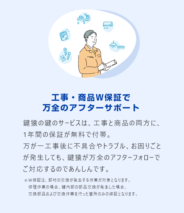 部材の交換や取り付けをともなう施工には、工事・商品ともに1年間のW保証が付帯。
