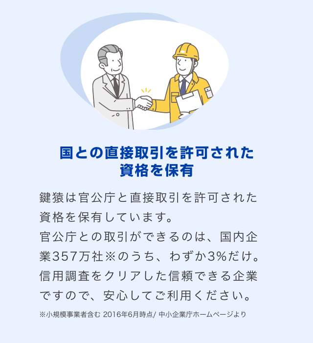 企業様と提携するにあたり、企業様の顧客にしっかりとしたサービス(対応・技術・価格)を行う事ができるかという審査は非常に厳格です。鍵猿は各社の審査規準をクリアし、たくさんの企業様にご用命をいただいております。