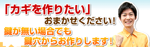合鍵作製はもちろん、手元に鍵が1本も無い場合でも、鍵穴から鍵をお作りします。出張したその場で作成可能ですので、鍵折れや鍵の紛失など、新たに鍵が必要な時は、お急ぎでも迅速な対応が可能です!