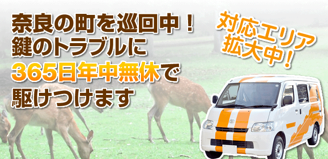 鍵のトラブルや防犯対策などを解決するために、奈良県を広範囲に対応!365日年中無休で鍵のプロスタッフが巡回しています。お近くのスタッフが素早く駆けつけます!
