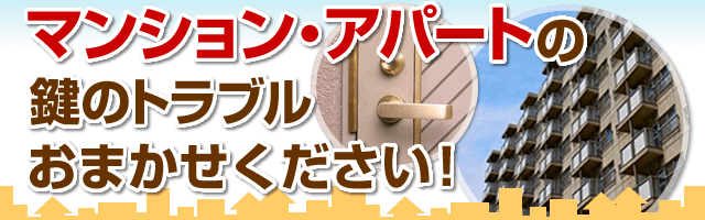 玄関の鍵を無くした、鍵を替えたい、鍵をもうひとつ取り付けたい。マンションの鍵のトラブルはお任せ下さい。夜間・早朝・休日も対応、年中無休で駆けつけます!